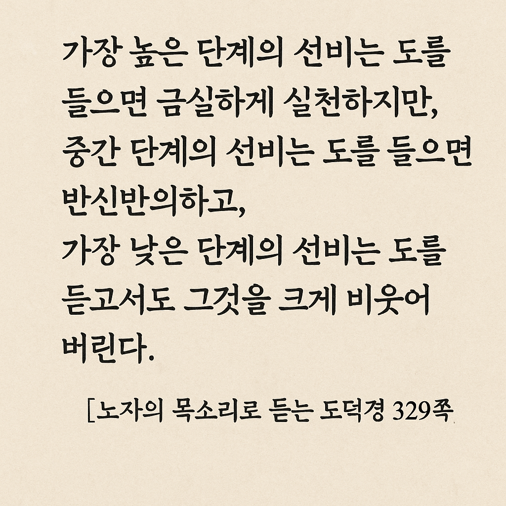 [오늘의 명언] 가장 높은 단계의 선비는 도를 들으면 그것을 성실하게 실천하지만, 중간 단계의 선비는 도를 들으면 반신반의하고, 가장 낮은 단계의 선비는 도를 듣고서도 그것을 크게 비웃어 버린다. - [노자의 목소리로 듣는 도덕경] 329쪽